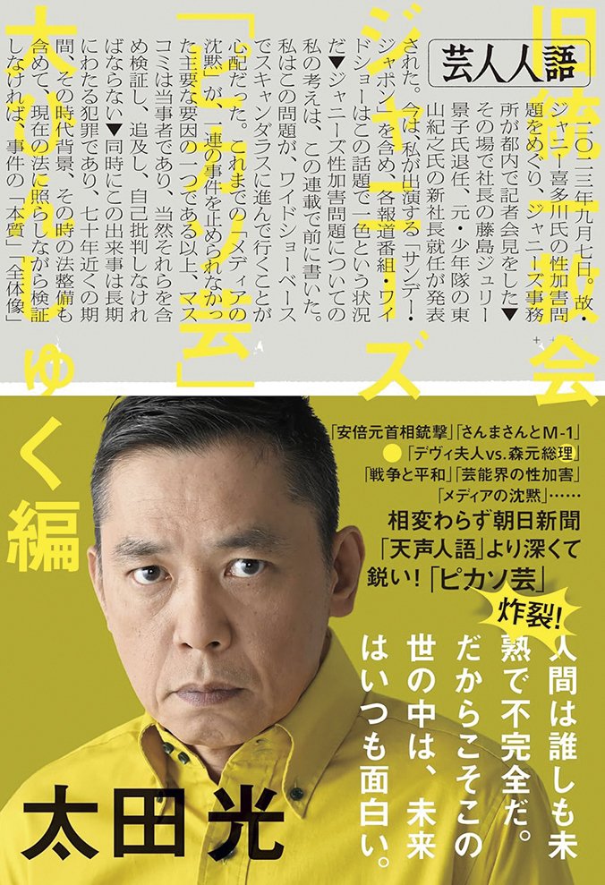 太田光が「勇気がある」と言われる書籍を出版「コロナ、戦争、安倍晋三前首相の事件、旧統一教会、ジャニーズ」に意見する理由 太田光の「THE CHANGE」インタビュー#2 太田光 2024.10.4 #太田光 #爆笑問題 #三谷幸喜 #安倍晋三 #太田光代 #田中裕二 【画像】太田光の書籍『芸人人語 旧統一教会・ジャニーズ・「ピカソ芸」大ひんしゅく編』 『芸人人語 旧統一教会・ジャニーズ・「ピカソ芸」大ひんしゅく編』 (THE CHANGE編集部) 1 2 3 太田光 (おおたひかり) お笑い芸人 1965年5月13日、埼玉県出身。1988年、日本大学芸術学部演劇学科で知り合った田中裕二とのお笑いコンビ『爆笑問題』としてデビュー。以降、お笑いタレント、司会者、作詞家、文筆家、川柳作家として活躍の場を広げる。 太田光の「THE CHANGE」 太田光が今のテレビ業界を憂う「オレはテレビが幼稚になっていると感じている」ターゲットの若者層の心を掴むには? 太田光の「THE CHANGE」#1 関連記事 小堺一機「大事なのは現場の温度」勝新太郎から受けた驚きの演技指導!「クロ子とグレ子」誕生前に関根勤とともに呼ばれた欽ちゃんの自宅 THE CHANGE編集部 2024.9.20 タレント・丸山礼「“普通界のクイーン”でいます!」女優業や『新しいカギ』でのコント、YouTube…活動の軸となっているポリシー 有山千春 2024.9.20 マギー司郎が戒めのために持ち歩く1枚の写真「25歳、かっこつけていた時期です。気持ち悪いでしょう」『お笑いスター誕生!!』を経て訪れた変化 有山千春 2024.9.16 サンプラザ中野くん「“これから猿岩石を探してもらいます”って言うんです。“はああ?“って」『電波少年』ガチ企画ヒッチハイク旅と活動休止期間に襲った絶望感 池守りぜね 2024.9.8